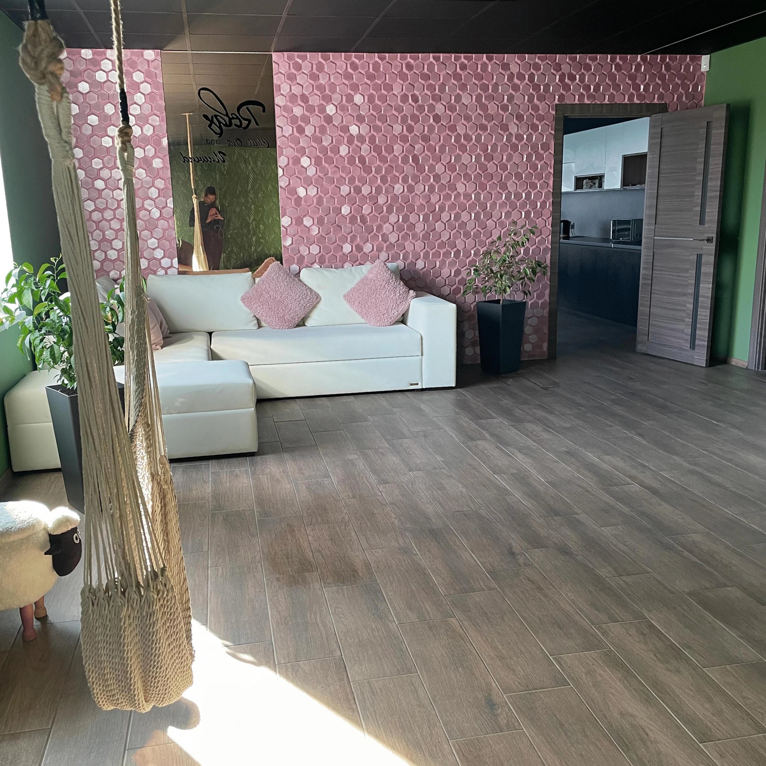 Має великий шкіряний диван, пуфи-дивани, пуфи-крісла і авжеж гамак
